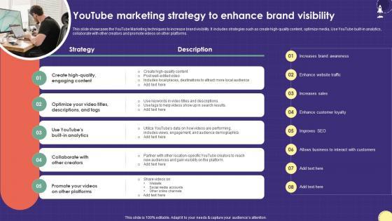 This slide showcases the YouTube Marketing techniques to increase brand visibility. It includes strategies such as create high-quality content, optimize media, Use YouTube built-in analytics, collaborate with other creators and promote videos on other platforms. Welcome to our selection of the Youtube Marketing Strategy To Enhance Brand Visibility School Enrollment Enhancement Strategy SS V. These are designed to help you showcase your creativity and bring your sphere to life. Planning and Innovation are essential for any business that is just starting out. This collection contains the designs that you need for your everyday presentations. All of our PowerPoints are 100 percent editable, so you can customize them to suit your needs. This multi-purpose template can be used in various situations. Grab these presentation templates today. This slide showcases the YouTube Marketing techniques to increase brand visibility. It includes strategies such as create high-quality content, optimize media, Use YouTube built-in analytics, collaborate with other creators and promote videos on other platforms.