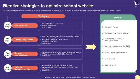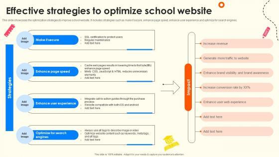 This slide showcases the optimization strategies to improve school website. It includes strategies such as make it secure, enhance page speed, enhance user experience and optimize for search engines. Present like a pro with Effective Strategies To Optimize School Website School Enrollment Enhancement Strategy SS V. Create beautiful presentations together with your team, using our easy-to-use presentation slides. Share your ideas in real-time and make changes on the fly by downloading our templates. So whether you re in the office, on the go, or in a remote location, you can stay in sync with your team and present your ideas with confidence. With Slidegeeks presentation got a whole lot easier. Grab these presentations today. This slide showcases the optimization strategies to improve school website. It includes strategies such as make it secure, enhance page speed, enhance user experience and optimize for search engines.