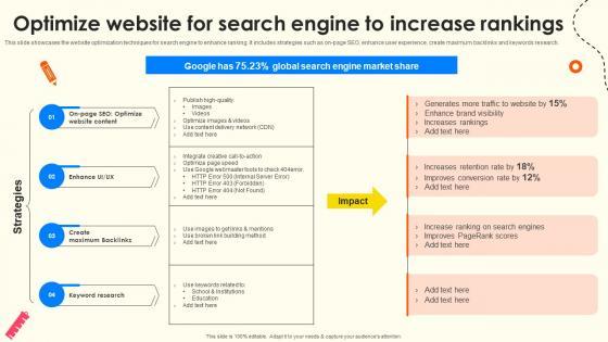 This slide showcases the website optimization techniques for search engine to enhance ranking. It includes strategies such as on-page SEO, enhance user experience, create maximum backlinks and keywords research. Boost your pitch with our creative Optimize Website For Search Engine To Increase Rankings School Enrollment Enhancement Strategy SS V. Deliver an awe-inspiring pitch that will mesmerize everyone. Using these presentation templates you will surely catch everyones attention. You can browse the ppts collection on our website. We have researchers who are experts at creating the right content for the templates. So you do not have to invest time in any additional work. Just grab the template now and use them. This slide showcases the website optimization techniques for search engine to enhance ranking. It includes strategies such as on-page SEO, enhance user experience, create maximum backlinks and keywords research.