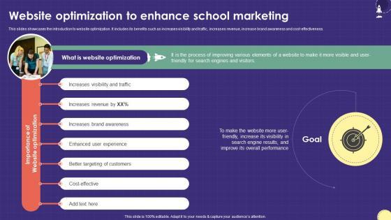 This slides showcases the introduction to website optimization. It includes its benefits such as increases visibility and traffic, increases revenue, increase brand awareness and cost-effectiveness. This modern and well-arranged Website Optimization To Enhance School Marketing Plan For Boosting School Strategy SS V provides lots of creative possibilities. It is very simple to customize and edit with the Powerpoint Software. Just drag and drop your pictures into the shapes. All facets of this template can be edited with Powerpoint, no extra software is necessary. Add your own material, put your images in the places assigned for them, adjust the colors, and then you can show your slides to the world, with an animated slide included. This slides showcases the introduction to website optimization. It includes its benefits such as increases visibility and traffic, increases revenue, increase brand awareness and cost-effectiveness.