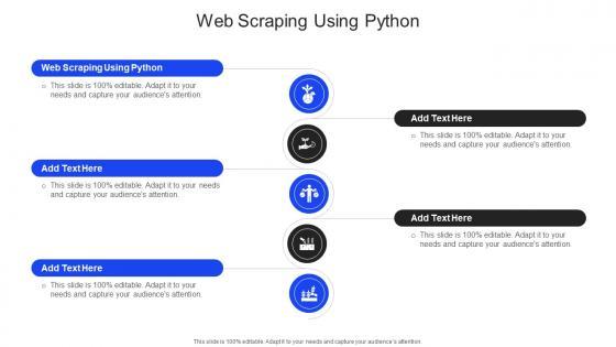 Introducing our well-designed Web Scraping Using Python In Powerpoint And Google Slides Cpb. This PowerPoint design presents information on topics like Web Scraping Using Python. As it is predesigned it helps boost your confidence level. It also makes you a better presenter because of its high-quality content and graphics. This PPT layout can be downloaded and used in different formats like PDF, PNG, and JPG. Not only this, it is available in both Standard Screen and Widescreen aspect ratios for your convenience. Therefore, click on the download button now to persuade and impress your audience. Our Web Scraping Using Python In Powerpoint And Google Slides Cpb are topically designed to provide an attractive backdrop to any subject. Use them to look like a presentation pro.