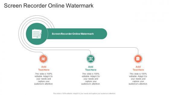 Introducing our well designed Screen Recorder Online Watermark In Powerpoint And Google Slides Cpb. This PowerPoint design presents information on topics like Screen Recorder Online Watermark. As it is predesigned it helps boost your confidence level. It also makes you a better presenter because of its high quality content and graphics. This PPT layout can be downloaded and used in different formats like PDF, PNG, and JPG. Not only this, it is available in both Standard Screen and Widescreen aspect ratios for your convenience. Therefore, click on the download button now to persuade and impress your audience. Our Screen Recorder Online Watermark In Powerpoint And Google Slides Cpb are topically designed to provide an attractive backdrop to any subject. Use them to look like a presentation pro.