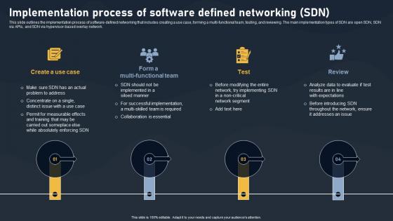 This slide outlines the implementation process of software-defined networking that includes creating a use case, forming a multi-functional team, testing, and reviewing. The main implementation types of SDN are open SDN, SDN via APIs, and SDN via hypervisor-based overlay network. Retrieve professionally designed Implementation Process Of Software Defined Networking SDN Ppt Portfolio Graphic Tips PDF to effectively convey your message and captivate your listeners. Save time by selecting pre made slideshows that are appropriate for various topics, from business to educational purposes. These themes come in many different styles, from creative to corporate, and all of them are easily adjustable and can be edited quickly. Access them as PowerPoint templates or as Google Slides themes. You do not have to go on a hunt for the perfect presentation because Slidegeeks got you covered from everywhere.