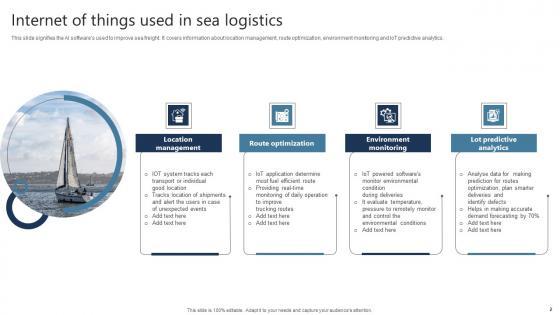 This slide signifies the AI softwares used to improve sea freight. It covers information about location management, route optimization, environment monitoring and IoT predictive analytics. Pitch your topic with ease and precision using this Internet Of Things Used In Sea Logistics Guidelines Pdf This layout presents information on Location Management, Route Optimization, Environment Monitoring It is also available for immediate download and adjustment. So, changes can be made in the color, design, graphics or any other component to create a unique layout. This slide signifies the AI softwares used to improve sea freight. It covers information about location management, route optimization, environment monitoring and IoT predictive analytics.