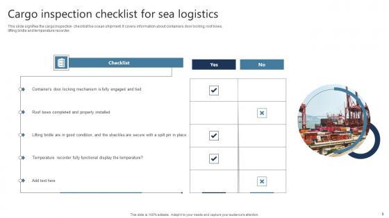 This slide signifies the cargo inspection checklist foe ocean shipment. It covers information about containers door locking, roof bows, lifting bridle and temperature recorder. Showcasing this set of slides titled Cargo Inspection Checklist For Sea Logistics Information Pdf The topics addressed in these templates are Properly Installed, Temperature Recorder, Display The Temperature All the content presented in this PPT design is completely editable. Download it and make adjustments in color, background, font etc. as per your unique business setting. This slide signifies the cargo inspection checklist foe ocean shipment. It covers information about containers door locking, roof bows, lifting bridle and temperature recorder.