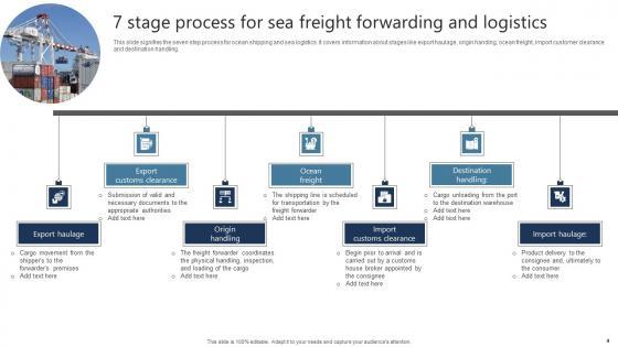 This slide signifies the seven step process for ocean shipping and sea logistics. It covers information about stages like export haulage, origin handing, ocean freight, import customer clearance and destination handling. Showcasing this set of slides titled 7 Stage Process For Sea Freight Forwarding And Logistics Download Pdf The topics addressed in these templates are Export Haulage, Origin Handling, Destination Handling All the content presented in this PPT design is completely editable. Download it and make adjustments in color, background, font etc. as per your unique business setting. This slide signifies the seven step process for ocean shipping and sea logistics. It covers information about stages like export haulage, origin handing, ocean freight, import customer clearance and destination handling.