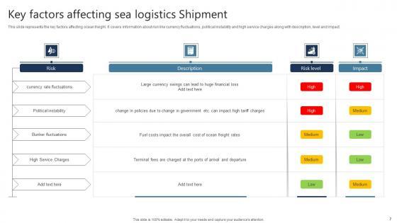 This slide represents the key factors affecting ocean freight. It covers information about risk like currency fluctuations, political instability and high service charges along with description, level and impact. Showcasing this set of slides titled Key Factors Affecting Sea Logistics Shipment Professional Pdf The topics addressed in these templates are Currency Rate Fluctuations, Political Instability, Bunker Fluctuations All the content presented in this PPT design is completely editable. Download it and make adjustments in color, background, font etc. as per your unique business setting. This slide represents the key factors affecting ocean freight. It covers information about risk like currency fluctuations, political instability and high service charges along with description, level and impact.