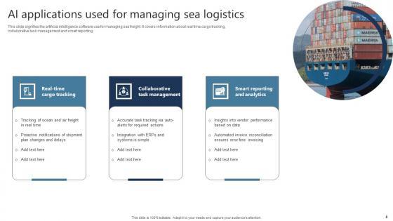 This slide signifies the artificial intelligence software use for managing sea freight. It covers information about real time cargo tracking, collaborative task management and smart reporting. Pitch your topic with ease and precision using this Ai Applications Used For Managing Sea Logistics Themes Pdf This layout presents information on Cargo Tracking, Collaborative Task Management, Reporting And Analytics It is also available for immediate download and adjustment. So, changes can be made in the color, design, graphics or any other component to create a unique layout. This slide signifies the artificial intelligence software use for managing sea freight. It covers information about real time cargo tracking, collaborative task management and smart reporting.
