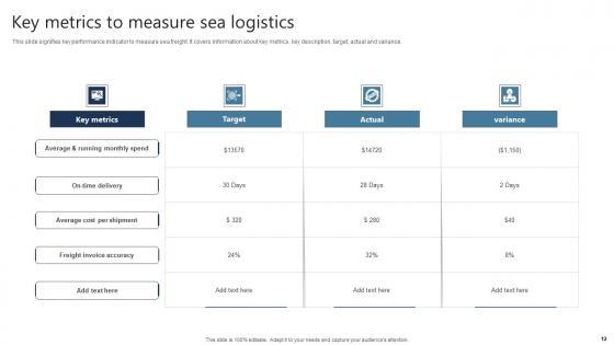 This slide signifies key performance indicator to measure sea freight. It covers information about key metrics, key description, target, actual and variance. Pitch your topic with ease and precision using this Key Metrics To Measure Sea Logistics Graphics Pdf This layout presents information on Freight Invoice Accuracy, Key Metrics, Target It is also available for immediate download and adjustment. So, changes can be made in the color, design, graphics or any other component to create a unique layout. This slide signifies key performance indicator to measure sea freight. It covers information about key metrics, key description, target, actual and variance.