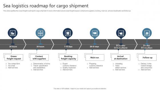 This slide signifies the ocean freight roadmap for cargo shipment. It covers information about ocean freight request, contact and suppliers, booking, main run, arrival at destination and follow up. Showcasing this set of slides titled Sea Logistics Roadmap For Cargo Shipment Portrait Pdf The topics addressed in these templates are Ocean Freight Request, Contact With Suppliers, Main Run All the content presented in this PPT design is completely editable. Download it and make adjustments in color, background, font etc. as per your unique business setting. This slide signifies the ocean freight roadmap for cargo shipment. It covers information about ocean freight request, contact and suppliers, booking, main run, arrival at destination and follow up.