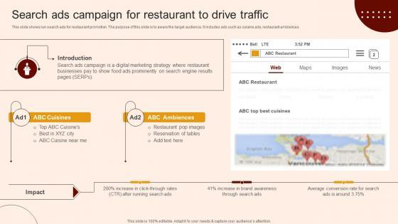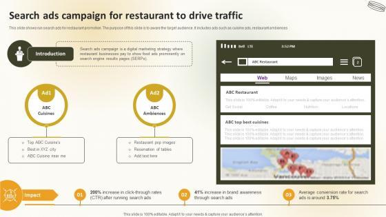 This slide shows run search ads for restaurant promotion. The purpose of this slide is to aware the target audience. It includes ads such as cuisine ads, restaurant ambiences. Whether you have daily or monthly meetings, a brilliant presentation is necessary. Search Ads Campaign For Restaurant To Drive Traffic Create An Effective Restaurant can be your best option for delivering a presentation. Represent everything in detail using Search Ads Campaign For Restaurant To Drive Traffic Create An Effective Restaurant and make yourself stand out in meetings. The template is versatile and follows a structure that will cater to your requirements. All the templates prepared by Slidegeeks are easy to download and edit. Our research experts have taken care of the corporate themes as well. So, give it a try and see the results. This slide shows run search ads for restaurant promotion. The purpose of this slide is to aware the target audience. It includes ads such as cuisine ads, restaurant ambiences.