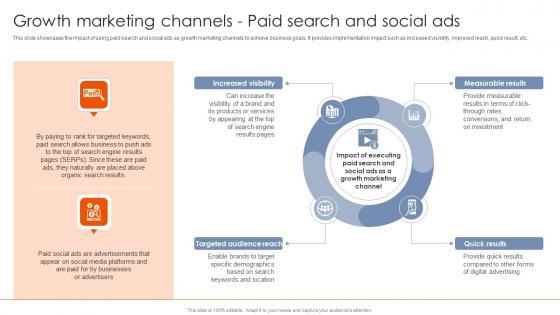 This slide showcases the impact of using paid search and social ads as growth marketing channels to achieve business goals. It provides implementation impact such as increased visibility, improved reach, quick result, etc. Slidegeeks has constructed Growth Marketing Channels Paid Search And Social Ads Best Practices For Using MKT SS V after conducting extensive research and examination. These presentation templates are constantly being generated and modified based on user preferences and critiques from editors. Here, you will find the most attractive templates for a range of purposes while taking into account ratings and remarks from users regarding the content. This is an excellent jumping-off point to explore our content and will give new users an insight into our top-notch PowerPoint Templates. This slide showcases the impact of using paid search and social ads as growth marketing channels to achieve business goals. It provides implementation impact such as increased visibility, improved reach, quick result, etc.