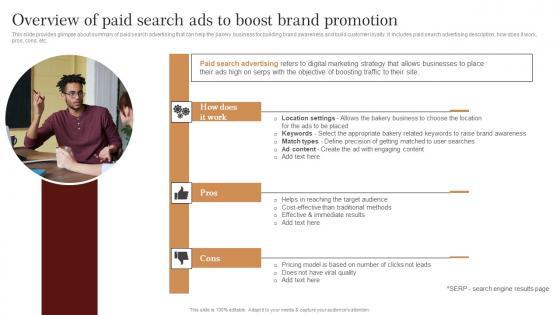 This slide provides glimpse about summary of paid search advertising that can help the bakery business for building brand awareness and build customer loyalty. It includes paid search advertising description, how does it work, pros, cons, etc.This Overview Of Paid Search Ads To Boost Brand Strategic Advertising Plan For Bakehouse Summary Pdf is perfect for any presentation, be it in front of clients or colleagues. It is a versatile and stylish solution for organizing your meetings. The Overview Of Paid Search Ads To Boost Brand Strategic Advertising Plan For Bakehouse Summary Pdf features a modern design for your presentation meetings. The adjustable and customizable slides provide unlimited possibilities for acing up your presentation. Slidegeeks has done all the homework before launching the product for you. So, do not wait, grab the presentation templates today This slide provides glimpse about summary of paid search advertising that can help the bakery business for building brand awareness and build customer loyalty. It includes paid search advertising description, how does it work, pros, cons, etc.