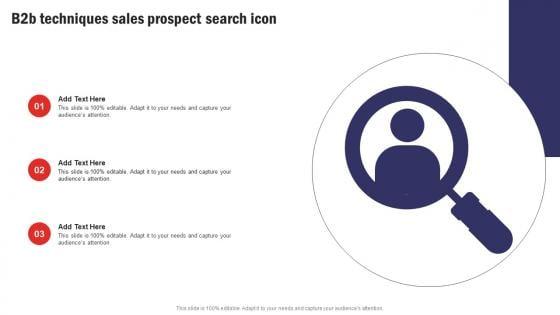 Pitch your topic with ease and precision using this B2B Techniques Sales Prospect Search Icon Designs Pdf. This layout presents information on B2B Techniques Sales, Prospect Search Icon. It is also available for immediate download and adjustment. So, changes can be made in the color, design, graphics or any other component to create a unique layout. Our B2B Techniques Sales Prospect Search Icon Designs Pdf are topically designed to provide an attractive backdrop to any subject. Use them to look like a presentation pro.