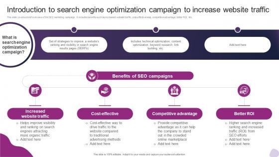 This slide covers a brief overview of the SEO marketing campaign. It includes benefits such as increased website traffic, cost-effectiveness, competitive advantage, better ROI, etc. Presenting this PowerPoint presentation, titled Introduction To Search Engine Optimization Campaign Powerful Marketing Techniques Strategy SS V, with topics curated by our researchers after extensive research. This editable presentation is available for immediate download and provides attractive features when used. Download now and captivate your audience. Presenting this Introduction To Search Engine Optimization Campaign Powerful Marketing Techniques Strategy SS V. Our researchers have carefully researched and created these slides with all aspects taken into consideration. This is a completely customizable Introduction To Search Engine Optimization Campaign Powerful Marketing Techniques Strategy SS V that is available for immediate downloading. Download now and make an impact on your audience. Highlight the attractive features available with our PPTs. This slide covers a brief overview of the SEO marketing campaign. It includes benefits such as increased website traffic, cost-effectiveness, competitive advantage, better ROI, etc.