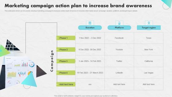This slide plan which can be used to develop marketing campaign to increase online reach of service. It includes information about campaign duration, platform, and target region details. Are you in need of a template that can accommodate all of your creative concepts This one is crafted professionally and can be altered to fit any style. Use it with Google Slides or PowerPoint. Include striking photographs, symbols, depictions, and other visuals. Fill, move around, or remove text boxes as desired. Test out color palettes and font mixtures. Edit and save your work, or work with colleagues. Download Marketing Campaign Action Plan Developing An Impactful SEO Marketing Plan Graphics Pdf and observe how to make your presentation outstanding. Give an impeccable presentation to your group and make your presentation unforgettable. This slide plan which can be used to develop marketing campaign to increase online reach of service. It includes information about campaign duration, platform, and target region details.