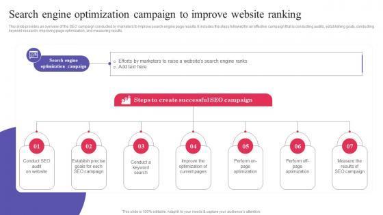 This slide provides an overview of the SEO campaign conducted by marketers to improve search engine page results. It includes the steps followed for an effective campaign that is conducting audits, establishing goals, conducting keyword research, improving page optimization, and measuring results. The best PPT templates are a great way to save time, energy, and resources. Slidegeeks have 100 percent editable powerpoint slides making them incredibly versatile. With these quality presentation templates, you can create a captivating and memorable presentation by combining visually appealing slides and effectively communicating your message. Download Search Engine Optimization Campaign To Improve Website Ranking Formats PDF from Slidegeeks and deliver a wonderful presentation.