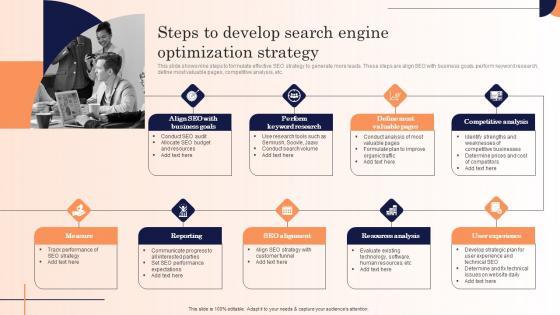 This slide shows nine steps to formulate effective SEO strategy to generate more leads. These steps are align SEO with business goals, perform keyword research, define most valuable pages, competitive analysis, etc. Slidegeeks is one of the best resources for PowerPoint templates. You can download easily and regulate Steps To Develop Search Engine Optimization Strategy Strategic Marketing Campaign Elements Pdf for your personal presentations from our wonderful collection. A few clicks is all it takes to discover and get the most relevant and appropriate templates. Use our Templates to add a unique zing and appeal to your presentation and meetings. All the slides are easy to edit and you can use them even for advertisement purposes. This slide shows nine steps to formulate effective SEO strategy to generate more leads. These steps are align SEO with business goals, perform keyword research, define most valuable pages, competitive analysis, etc.