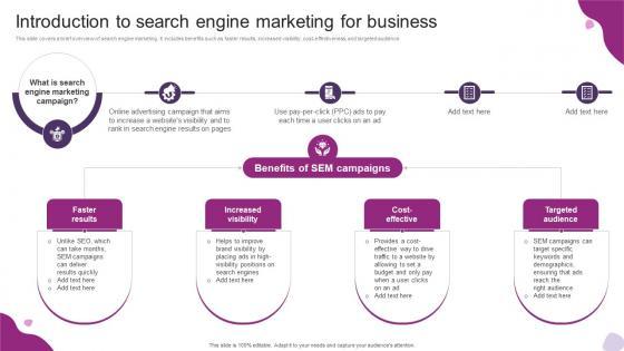 This slide covers a brief overview of search engine marketing. It includes benefits such as faster results, increased visibility, cost-effectiveness, and targeted audience. Slidegeeks has constructed Introduction To Search Engine Marketing For Business Powerful Marketing Techniques Strategy SS V after conducting extensive research and examination. These presentation templates are constantly being generated and modified based on user preferences and critiques from editors. Here, you will find the most attractive templates for a range of purposes while taking into account ratings and remarks from users regarding the content. This is an excellent jumping-off point to explore our content and will give new users an insight into our top-notch PowerPoint Templates. This slide covers a brief overview of search engine marketing. It includes benefits such as faster results, increased visibility, cost-effectiveness, and targeted audience.