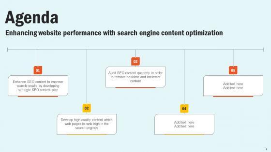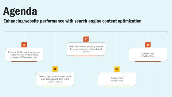 Boost your pitch with our creative Agenda Enhancing Website Performance With Search Engine Content Optimization Download Pdf. Deliver an awe inspiring pitch that will mesmerize everyone. Using these presentation templates you will surely catch everyones attention. You can browse the ppts collection on our website. We have researchers who are experts at creating the right content for the templates. So you do not have to invest time in any additional work. Just grab the template now and use them. Our Agenda Enhancing Website Performance With Search Engine Content Optimization Download Pdf are topically designed to provide an attractive backdrop to any subject. Use them to look like a presentation pro.
