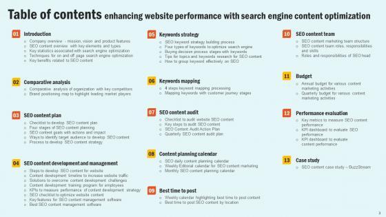 Get a simple yet stunning designed Table Of Contents Enhancing Website Performance With Search Engine Content Optimization Slides Pdf. It is the best one to establish the tone in your meetings. It is an excellent way to make your presentations highly effective. So, download this PPT today from Slidegeeks and see the positive impacts. Our easy to edit Table Of Contents Enhancing Website Performance With Search Engine Content Optimization Slides Pdf can be your go to option for all upcoming conferences and meetings. So, what are you waiting for Grab this template today. Our Table Of Contents Enhancing Website Performance With Search Engine Content Optimization Slides Pdf are topically designed to provide an attractive backdrop to any subject. Use them to look like a presentation pro.