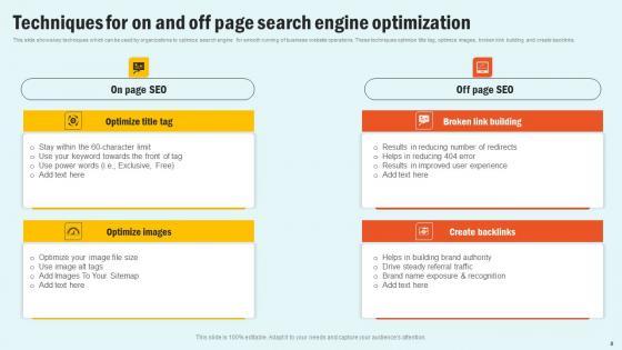 This slide shows key techniques which can be used by organizations to optimize search engine for smooth running of business website operations. These techniques optimize title tag, optimize images, broken kink building and create backlinks. Present like a pro with Techniques For On And Off Page Search Engine Optimization Seo Content Plan To Drive Strategy SS V Create beautiful presentations together with your team, using our easy-to-use presentation slides. Share your ideas in real-time and make changes on the fly by downloading our templates. So whether you are in the office, on the go, or in a remote location, you can stay in sync with your team and present your ideas with confidence. With Slidegeeks presentation got a whole lot easier. Grab these presentations today. This slide shows key techniques which can be used by organizations to optimize search engine for smooth running of business website operations. These techniques optimize title tag, optimize images, broken kink building and create backlinks.