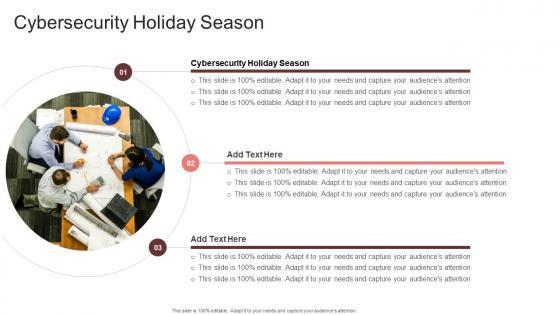 Presenting our innovatively-designed set of slides titled Cybersecurity Holiday Season In Powerpoint And Google Slides Cpb. This completely editable PowerPoint graphic exhibits Cybersecurity Holiday Season that will help you convey the message impactfully. It can be accessed with Google Slides and is available in both standard screen and widescreen aspect ratios. Apart from this, you can download this well-structured PowerPoint template design in different formats like PDF, JPG, and PNG. So, click the download button now to gain full access to this PPT design. Our Cybersecurity Holiday Season In Powerpoint And Google Slides Cpb are topically designed to provide an attractive backdrop to any subject. Use them to look like a presentation pro.
