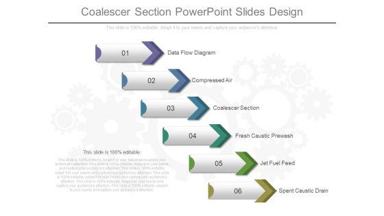 This is a coalescer section powerpoint slides design. This is a six stage process. The stages in this process are data flow diagram, compressed air, coalescer section, fresh caustic prewash, jet fuel feed, spent caustic drain.