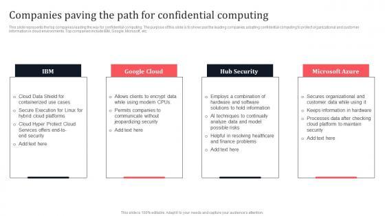 This slide represents the top companies leading the way for confidential computing. The purpose of this slide is to showcase the leading companies adopting confidential computing to protect organizational and customer information in cloud environments. Top companies include IBM, Google, Microsoft, etc. There are so many reasons you need a Companies Paving The Path For Confidential Computing Secure Multi Party Elements Pdf The first reason is you can not spend time making everything from scratch, Thus, Slidegeeks has made presentation templates for you too. You can easily download these templates from our website easily. This slide represents the top companies leading the way for confidential computing. The purpose of this slide is to showcase the leading companies adopting confidential computing to protect organizational and customer information in cloud environments. Top companies include IBM, Google, Microsoft, etc.
