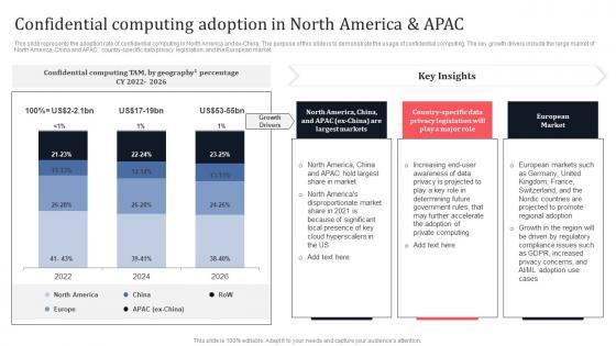 This slide represents the adoption rate of confidential computing in North America and ex-China. The purpose of this slide is to demonstrate the usage of confidential computing. The key growth drivers include the large market of North America, China and APAC, country-specific data privacy legislation, and the European market. From laying roadmaps to briefing everything in detail, our templates are perfect for you. You can set the stage with your presentation slides. All you have to do is download these easy-to-edit and customizable templates. Confidential Computing Adoption In North America And APAC Secure Multi Party Brochure Pdf will help you deliver an outstanding performance that everyone would remember and praise you for. Do download this presentation today. This slide represents the adoption rate of confidential computing in North America and ex-China. The purpose of this slide is to demonstrate the usage of confidential computing. The key growth drivers include the large market of North America, China and APAC, country-specific data privacy legislation, and the European market.