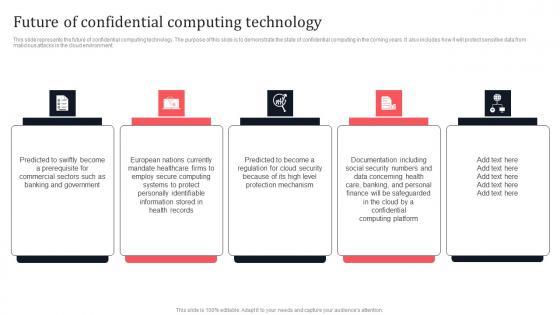 This slide represents the future of confidential computing technology. The purpose of this slide is to demonstrate the state of confidential computing in the coming years. It also includes how it will protect sensitive data from malicious attacks in the cloud environment. Slidegeeks has constructed Future Of Confidential Computing Technology Secure Multi Party Rules Pdf after conducting extensive research and examination. These presentation templates are constantly being generated and modified based on user preferences and critiques from editors. Here, you will find the most attractive templates for a range of purposes while taking into account ratings and remarks from users regarding the content. This is an excellent jumping-off point to explore our content and will give new users an insight into our top-notch PowerPoint Templates. This slide represents the future of confidential computing technology. The purpose of this slide is to demonstrate the state of confidential computing in the coming years. It also includes how it will protect sensitive data from malicious attacks in the cloud environment.