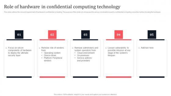 This slide outlines the role and requirement of hardware in confidential computing. The purpose of this slide is to showcase the various constraints issued by confidential computing consortium while choosing the hardware. Do you have an important presentation coming up Are you looking for something that will make your presentation stand out from the rest Look no further than Role Of Hardware In Confidential Computing Technology Secure Multi Party Download Pdf With our professional designs, you can trust that your presentation will pop and make delivering it a smooth process. And with Slidegeeks, you can trust that your presentation will be unique and memorable. So why wait Grab Role Of Hardware In Confidential Computing Technology Secure Multi Party Download Pdf today and make your presentation stand out from the rest. This slide outlines the role and requirement of hardware in confidential computing. The purpose of this slide is to showcase the various constraints issued by confidential computing consortium while choosing the hardware.
