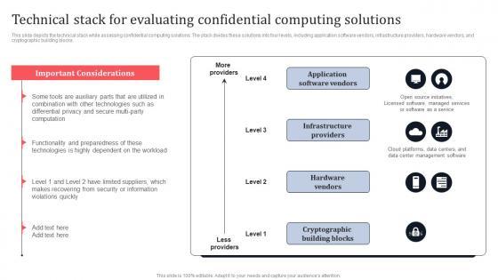This slide depicts the technical stack while assessing confidential computing solutions. The stack divides these solutions into four levels, including application software vendors, infrastructure providers, hardware vendors, and cryptographic building blocks. If your project calls for a presentation, then Slidegeeks is your go-to partner because we have professionally designed, easy-to-edit templates that are perfect for any presentation. After downloading, you can easily edit Technical Stack For Evaluating Confidential Computing Solutions Secure Multi Party Topics Pdf and make the changes accordingly. You can rearrange slides or fill them with different images. Check out all the handy templates This slide depicts the technical stack while assessing confidential computing solutions. The stack divides these solutions into four levels, including application software vendors, infrastructure providers, hardware vendors, and cryptographic building blocks.