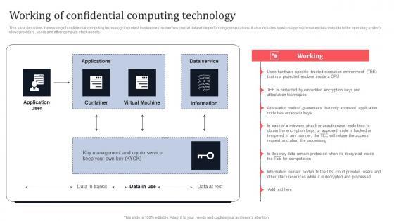 This slide describes the working of confidential computing technology to protect businesses in-memory crucial data while performing computations. It also includes how this approach makes data invisible to the operating system, cloud providers, users and other compute stack assets. Coming up with a presentation necessitates that the majority of the effort goes into the content and the message you intend to convey. The visuals of a PowerPoint presentation can only be effective if it supplements and supports the story that is being told. Keeping this in mind our experts created Working Of Confidential Computing Technology Secure Multi Party Information Pdf to reduce the time that goes into designing the presentation. This way, you can concentrate on the message while our designers take care of providing you with the right template for the situation. This slide describes the working of confidential computing technology to protect businesses in-memory crucial data while performing computations. It also includes how this approach makes data invisible to the operating system, cloud providers, users and other compute stack assets.