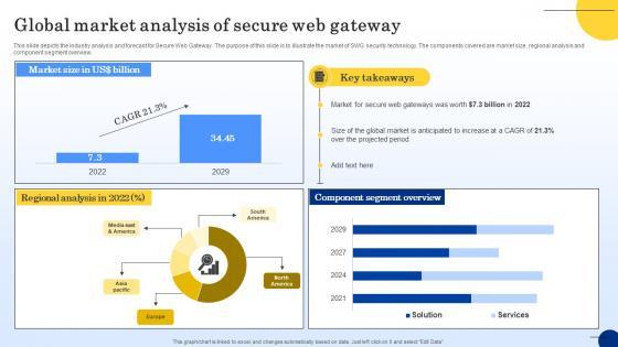 This slide depicts the industry analysis and forecast for Secure Web Gateway. The purpose of this slide is to illustrate the market of SWG security technology. The components covered are market size, regional analysis and component segment overview. If you are looking for a format to display your unique thoughts, then the professionally designed Global Market Analysis Of Secure Web Gateway Web Threat Protection System is the one for you. You can use it as a Google Slides template or a PowerPoint template. Incorporate impressive visuals, symbols, images, and other charts. Modify or reorganize the text boxes as you desire. Experiment with shade schemes and font pairings. Alter, share or cooperate with other people on your work. Download Global Market Analysis Of Secure Web Gateway Web Threat Protection System and find out how to give a successful presentation. Present a perfect display to your team and make your presentation unforgettable. This slide depicts the industry analysis and forecast for Secure Web Gateway. The purpose of this slide is to illustrate the market of SWG security technology. The components covered are market size, regional analysis and component segment overview.