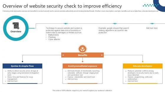 Following slide represents overview and benefits to conduct security test to assure website authenticity and eliminate potential threats. It further covers description, example, benefits such as simpler fixes, educate developers etc. Want to ace your presentation in front of a live audience Our Overview Of Website Security Check To Improve Efficiency Step By Step Guide Slides PDF can help you do that by engaging all the users towards you. Slidegeeks experts have put their efforts and expertise into creating these impeccable powerpoint presentations so that you can communicate your ideas clearly. Moreover, all the templates are customizable, and easy-to-edit and downloadable. Use these for both personal and commercial use. Following slide represents overview and benefits to conduct security test to assure website authenticity and eliminate potential threats. It further covers description, example, benefits such as simpler fixes, educate developers etc.
