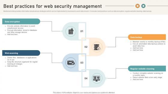 Mentioned slide provides information about various strategies which can be implemented by business to avoid data breach. It includes best practices such as data encryption, regular website cleaning, data backup This modern and well-arranged Comprehensive Guide For Website Development Best Practices For Web Security Management provides lots of creative possibilities. It is very simple to customize and edit with the Powerpoint Software. Just drag and drop your pictures into the shapes. All facets of this template can be edited with Powerpoint, no extra software is necessary. Add your own material, put your images in the places assigned for them, adjust the colors, and then you can show your slides to the world, with an animated slide included. Mentioned slide provides information about various strategies which can be implemented by business to avoid data breach. It includes best practices such as data encryption, regular website cleaning, data backup