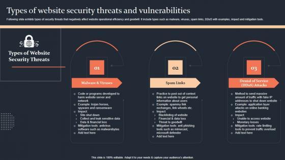Following slide exhibits types of security threats that negatively affect website operational efficiency and goodwill. It include types such as malware, viruses, spam links, DDoS with examples, impact and mitigation tools. There are so many reasons you need a Types Of Website Security Threats And Vulnerabilities Step By Step Guide Structure PDF. The first reason is you can not spend time making everything from scratch, Thus, Slidegeeks has made presentation templates for you too. You can easily download these templates from our website easily. Following slide exhibits types of security threats that negatively affect website operational efficiency and goodwill. It include types such as malware, viruses, spam links, DDoS with examples, impact and mitigation tools.