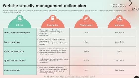 Mentioned slide provides insights into site security management tips which can be implemented by businesses to prevent hacking. It includes key components such as select secure domain registrar, use safe plugins, anti malware programs, regular backup, etc. Welcome to our selection of the Managing Technical And Non Website Security Management Action Plan. These are designed to help you showcase your creativity and bring your sphere to life. Planning and Innovation are essential for any business that is just starting out. This collection contains the designs that you need for your everyday presentations. All of our PowerPoints are 100Percent editable, so you can customize them to suit your needs. This multi-purpose template can be used in various situations. Grab these presentation templates today. Mentioned slide provides insights into site security management tips which can be implemented by businesses to prevent hacking. It includes key components such as select secure domain registrar, use safe plugins, anti malware programs, regular backup, etc.