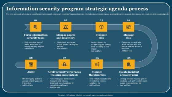This slide represents action plan process for information security programs. It consists of steps such as make information security team, manage assets and inventory, evaluate risk, manage risk, create incident recovery plan, etc. Showcasing this set of slides titled Information Security Program Strategic Agenda Process Microsoft Pdf. The topics addressed in these templates are Assets And Inventory, Evaluate Risk, Manage Risk. All the content presented in this PPT design is completely editable. Download it and make adjustments in color, background, font etc. as per your unique business setting. This slide represents action plan process for information security programs. It consists of steps such as make information security team, manage assets and inventory, evaluate risk, manage risk, create incident recovery plan, etc.