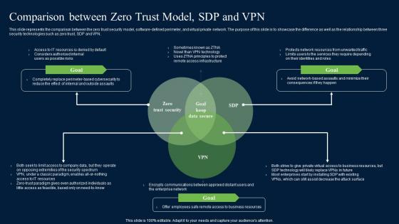This slide represents the comparison between the zero trust security model, software-defined perimeter, and virtual private network. The purpose of this slide is to showcase the difference as well as the relationship between three security technologies such as zero trust, SDP and VPN. Present like a pro with Comparison Between Zero Trust Model SDP Zero Trust Network Security Guidelines Pdf Create beautiful presentations together with your team, using our easy-to-use presentation slides. Share your ideas in real-time and make changes on the fly by downloading our templates. So whether you are in the office, on the go, or in a remote location, you can stay in sync with your team and present your ideas with confidence. With Slidegeeks presentation got a whole lot easier. Grab these presentations today. This slide represents the comparison between the zero trust security model, software-defined perimeter, and virtual private network. The purpose of this slide is to showcase the difference as well as the relationship between three security technologies such as zero trust, SDP and VPN.
