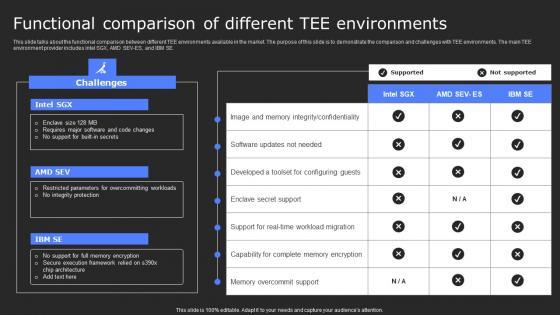 This slide talks about the functional comparison between different TEE environments available in the market. The purpose of this slide is to demonstrate the comparison and challenges with TEE environments. The main TEE environment provider includes intel SGX, AMD SEV-ES, and IBM SE. Slidegeeks has constructed Functional Comparison Of Different Tee Secure Computing Framework Diagrams Pdf after conducting extensive research and examination. These presentation templates are constantly being generated and modified based on user preferences and critiques from editors. Here, you will find the most attractive templates for a range of purposes while taking into account ratings and remarks from users regarding the content. This is an excellent jumping-off point to explore our content and will give new users an insight into our top-notch PowerPoint Templates. This slide talks about the functional comparison between different TEE environments available in the market. The purpose of this slide is to demonstrate the comparison and challenges with TEE environments. The main TEE environment provider includes intel SGX, AMD SEV-ES, and IBM SE.