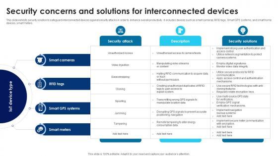 This slide exhibits security solution to safeguard interconnected devices against security attacks in order to enhance overall productivity. It includes devices such as smart cameras, RFID tags, Smart GPS systems, and smart home devices, smart meters. Find highly impressive Building Trust With IoT Security Concerns And Solutions For Interconnected Devices IoT SS V on Slidegeeks to deliver a meaningful presentation. You can save an ample amount of time using these presentation templates. No need to worry to prepare everything from scratch because Slidegeeks experts have already done a huge research and work for you. You need to download Building Trust With IoT Security Concerns And Solutions For Interconnected Devices IoT SS V for your upcoming presentation. All the presentation templates are 100 percent editable and you can change the color and personalize the content accordingly. Download now This slide exhibits security solution to safeguard interconnected devices against security attacks in order to enhance overall productivity. It includes devices such as smart cameras, RFID tags, Smart GPS systems, and smart home devices, smart meters.