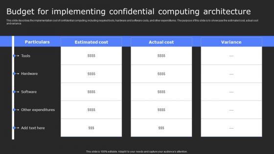 This slide describes the implementation cost of confidential computing, including required tools, hardware and software costs, and other expenditures. The purpose of this slide is to showcase the estimated cost, actual cost and variance. Want to ace your presentation in front of a live audience Our Budget For Implementing Confidential Secure Computing Framework Clipart Pdf can help you do that by engaging all the users towards you. Slidegeeks experts have put their efforts and expertise into creating these impeccable powerpoint presentations so that you can communicate your ideas clearly. Moreover, all the templates are customizable, and easy-to-edit and downloadable. Use these for both personal and commercial use. This slide describes the implementation cost of confidential computing, including required tools, hardware and software costs, and other expenditures. The purpose of this slide is to showcase the estimated cost, actual cost and variance.