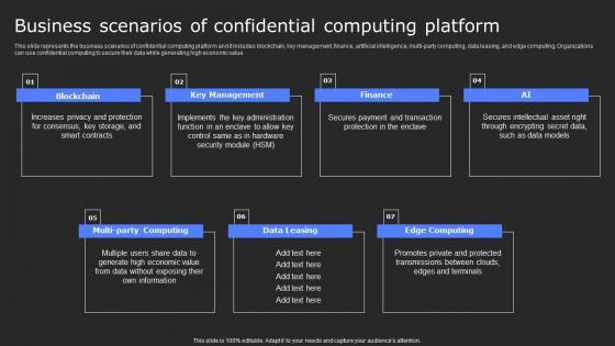 This slide represents the business scenarios of confidential computing platform and it includes blockchain, key management, finance, artificial intelligence, multi-party computing, data leasing, and edge computing. Organizations can use confidential computing to secure their data while generating high economic value. There are so many reasons you need a Business Scenarios Of Confidential Computing Secure Computing Framework Information Pdf. The first reason is you can not spend time making everything from scratch, Thus, Slidegeeks has made presentation templates for you too. You can easily download these templates from our website easily. This slide represents the business scenarios of confidential computing platform and it includes blockchain, key management, finance, artificial intelligence, multi-party computing, data leasing, and edge computing. Organizations can use confidential computing to secure their data while generating high economic value.