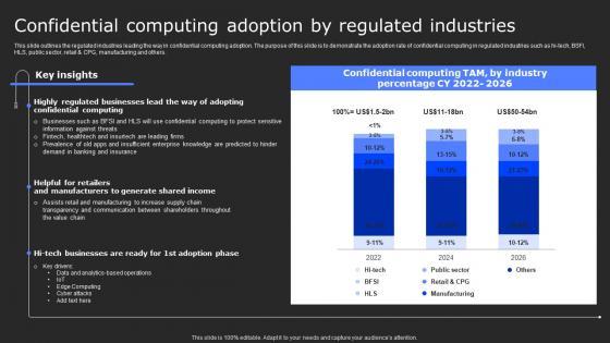 This slide outlines the regulated industries leading the way in confidential computing adoption. The purpose of this slide is to demonstrate the adoption rate of confidential computing in regulated industries such as hi-tech, BSFI, HLS, public sector, retail and CPG, manufacturing and others. Do you have an important presentation coming up Are you looking for something that will make your presentation stand out from the rest Look no further than Confidential Computing Adoption By Secure Computing Framework Mockup Pdf. With our professional designs, you can trust that your presentation will pop and make delivering it a smooth process. And with Slidegeeks, you can trust that your presentation will be unique and memorable. So why wait Grab Confidential Computing Adoption By Secure Computing Framework Mockup Pdf today and make your presentation stand out from the rest This slide outlines the regulated industries leading the way in confidential computing adoption. The purpose of this slide is to demonstrate the adoption rate of confidential computing in regulated industries such as hi-tech, BSFI, HLS, public sector, retail and CPG, manufacturing and others.