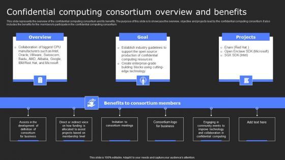 This slide represents the overview of the confidential computing consortium and its benefits. The purpose of this slide is to showcase the overview, objective and projects lead by the confidential computing consortium. It also includes the benefits for the members to participate in the confidential computing consortium. Make sure to capture your audiences attention in your business displays with our gratis customizable Confidential Computing Consortium Overview And Secure Computing Framework Inspiration Pdf. These are great for business strategies, office conferences, capital raising or task suggestions. If you desire to acquire more customers for your tech business and ensure they stay satisfied, create your own sales presentation with these plain slides. This slide represents the overview of the confidential computing consortium and its benefits. The purpose of this slide is to showcase the overview, objective and projects lead by the confidential computing consortium. It also includes the benefits for the members to participate in the confidential computing consortium.