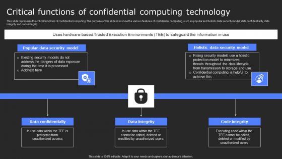 This slide represents the critical functions of confidential computing. The purpose of this slide is to show the various features of confidential computing, such as popular and holistic data security model, data confidentiality, data integrity and code integrity. Are you searching for a Critical Functions Of Confidential Computing Secure Computing Framework Microsoft Pdf that is uncluttered, straightforward, and original Its easy to edit, and you can change the colors to suit your personal or business branding. For a presentation that expresses how much effort you have put in, this template is ideal With all of its features, including tables, diagrams, statistics, and lists, its perfect for a business plan presentation. Make your ideas more appealing with these professional slides. Download Critical Functions Of Confidential Computing Secure Computing Framework Microsoft Pdf from Slidegeeks today. This slide represents the critical functions of confidential computing. The purpose of this slide is to show the various features of confidential computing, such as popular and holistic data security model, data confidentiality, data integrity and code integrity.