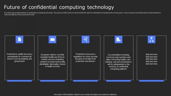This slide represents the future of confidential computing technology. The purpose of this slide is to demonstrate the state of confidential computing in the coming years. It also includes how it will protect sensitive data from malicious attacks in the cloud environment. Presenting this PowerPoint presentation, titled Future Of Confidential Computing Technology Secure Computing Framework Ideas Pdf, with topics curated by our researchers after extensive research. This editable presentation is available for immediate download and provides attractive features when used. Download now and captivate your audience. Presenting this Future Of Confidential Computing Technology Secure Computing Framework Ideas Pdf. Our researchers have carefully researched and created these slides with all aspects taken into consideration. This is a completely customizable Future Of Confidential Computing Technology Secure Computing Framework Ideas Pdf that is available for immediate downloading. Download now and make an impact on your audience. Highlight the attractive features available with our PPTs. This slide represents the future of confidential computing technology. The purpose of this slide is to demonstrate the state of confidential computing in the coming years. It also includes how it will protect sensitive data from malicious attacks in the cloud environment.