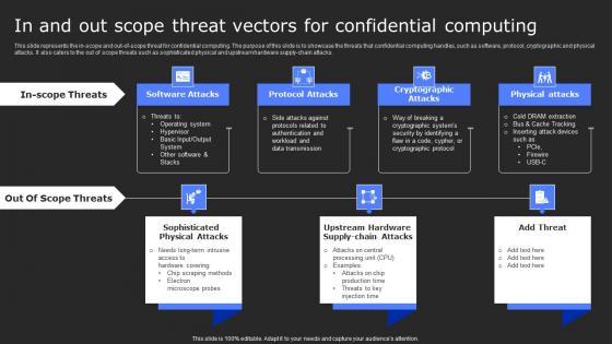 This slide represents the in-scope and out-of-scope threat for confidential computing. The purpose of this slide is to showcase the threats that confidential computing handles, such as software, protocol, cryptographic and physical attacks. It also caters to the out of scope threats such as sophisticated physical and upstream hardware supply-chain attacks. Take your projects to the next level with our ultimate collection of In And Out Scope Threat Vectors For Confidential Secure Computing Framework Inspiration Pdf. Slidegeeks has designed a range of layouts that are perfect for representing task or activity duration, keeping track of all your deadlines at a glance. Tailor these designs to your exact needs and give them a truly corporate look with your own brand colors they will make your projects stand out from the rest This slide represents the in-scope and out-of-scope threat for confidential computing. The purpose of this slide is to showcase the threats that confidential computing handles, such as software, protocol, cryptographic and physical attacks. It also caters to the out of scope threats such as sophisticated physical and upstream hardware supply-chain attacks.